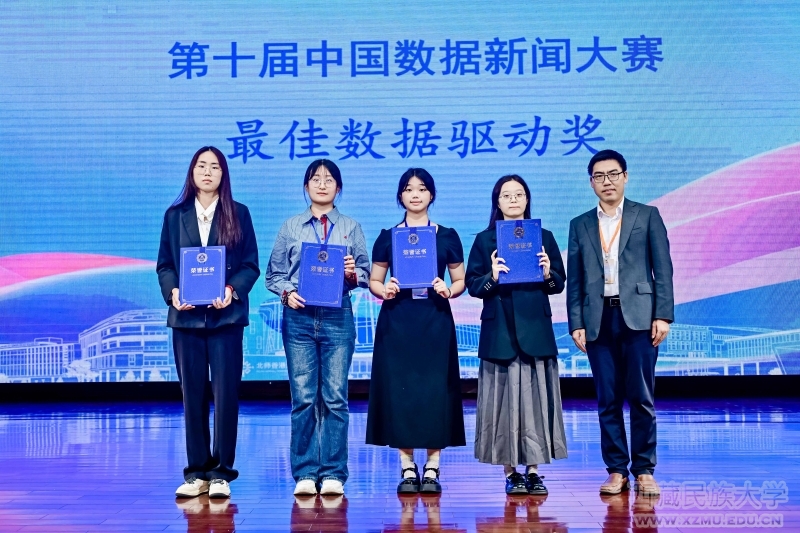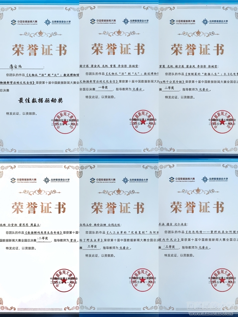 本次赛事是国内数据新闻领域极具影响力的专业赛事,以“数据为笔、传播为媒”搭建高校学子竞技平台。在学院领导的大力支持下,在指导老师化睿云、曾洁的全程带领下,历经多轮打磨备赛,从1400组参赛作品中脱颖而出,跻身全国总决赛,与各大高校300余团队展开激烈答辩与巅峰角逐。最终交出亮眼成绩单:23级新闻专业蒲金凤斩获大赛一等奖及“最佳数据驱动奖”;22级广电专业施璐、23级新闻专业曾慧获二等奖;23级新闻专业羊涵、曲珍拉姆获三等奖。